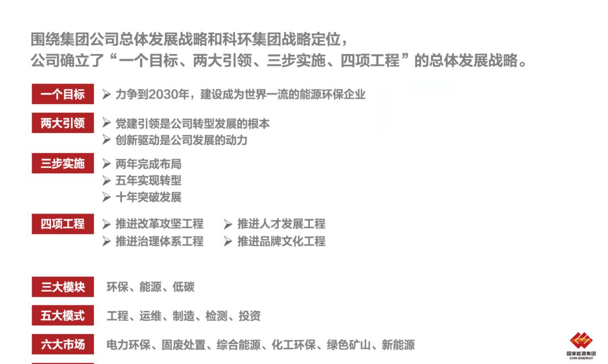 改革兴企,战略先行,绘出转型高质量发展的“新蓝图”。科学制定发展战略。提出从2021年到2030年分三步走,建成世界一流能源环保企业的战略目标,明确了转型业务布局,从根本上明晰了中长期发展方向。建立全周期战略管理体系,制定了涵盖总体发展规划与8个专项子规划的规划体系,梳理一套战略评价与滚动调整指标体系,在我国能源环保基层企业中率先建立了闭环的战略管理体系。