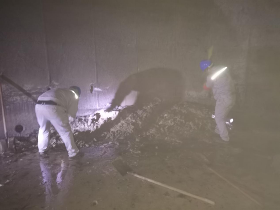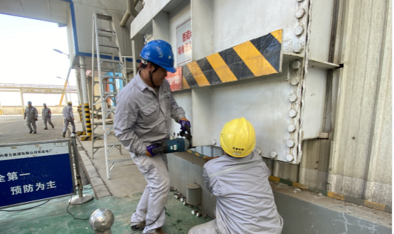 在脱硫2号吸收塔0米处,工作人员正在拆除脱硫2号吸收塔0米的人孔门螺栓,他们用电动扳手代替了以往的机械扳手,大大提高了机组检修效率。