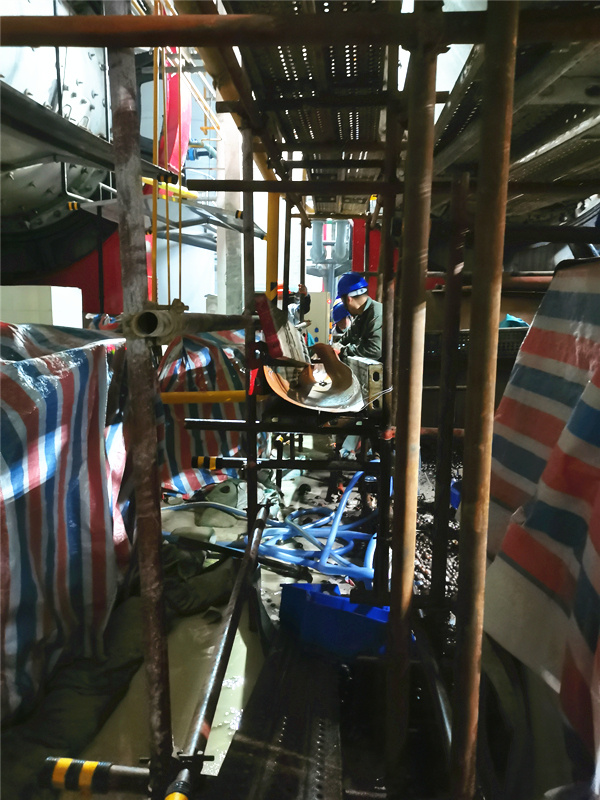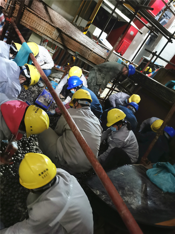3月28日,在钢球回装环节需人工筛捡35吨直径达标的钢球加入磨机系统,此项工作量大繁琐,分公司领导及时协调组织全员加入钢球回装工作。他们灵活使用身边的螺丝刀、小撬棍将钢球一个个从泥泞的浆液中挑选出来,收集在吊斗里再加入磨机滚筒中。工作中同志们的工作服被浆液浸湿也不怕脏;手指因长时间佩戴防护手套在浆液中挑拣泡的发白也不叫苦;在钢球池中一蹲就是数小时也不喊累。大家相互加油鼓劲共克时艰。29日晚,经过两天的全员行动最终完成全部的钢球回装工作,30日,完成人孔门封堵及试运,31日,试运合格此次检修项目顺利结束。